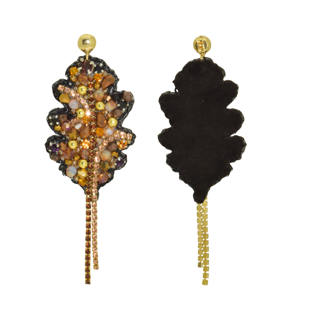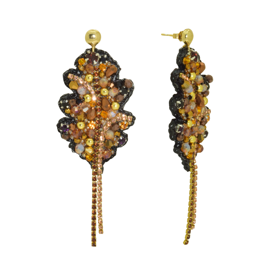 The organic leaf shape is handcrafted with a refined mix of glass beads and sparkling details in bronze, gold and amber hues. Deep black accents add contrast and depth, while the delicate gold-toned strands at the bottom create elegant movement. With every step, they catch the light — subtle, yet unmistakable.