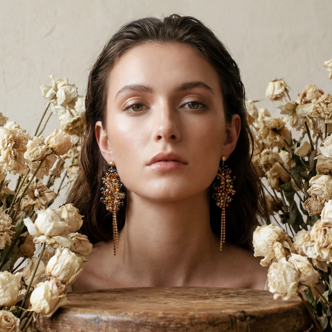 The Bronze Leaves earrings capture the warm glow of falling leaves, soft sunlight and rich earthy tones. A piece that shimmers gently while still making a powerful statement.