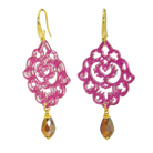 The Ornaments are made from high quality resins finished with small crystal drops. They are moulded and finished by hand and should certainly not be confused with the typical laser-cut plastic. These earrings have a deep and rich colour palette and are smoothly formed.