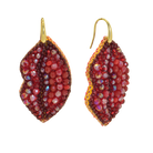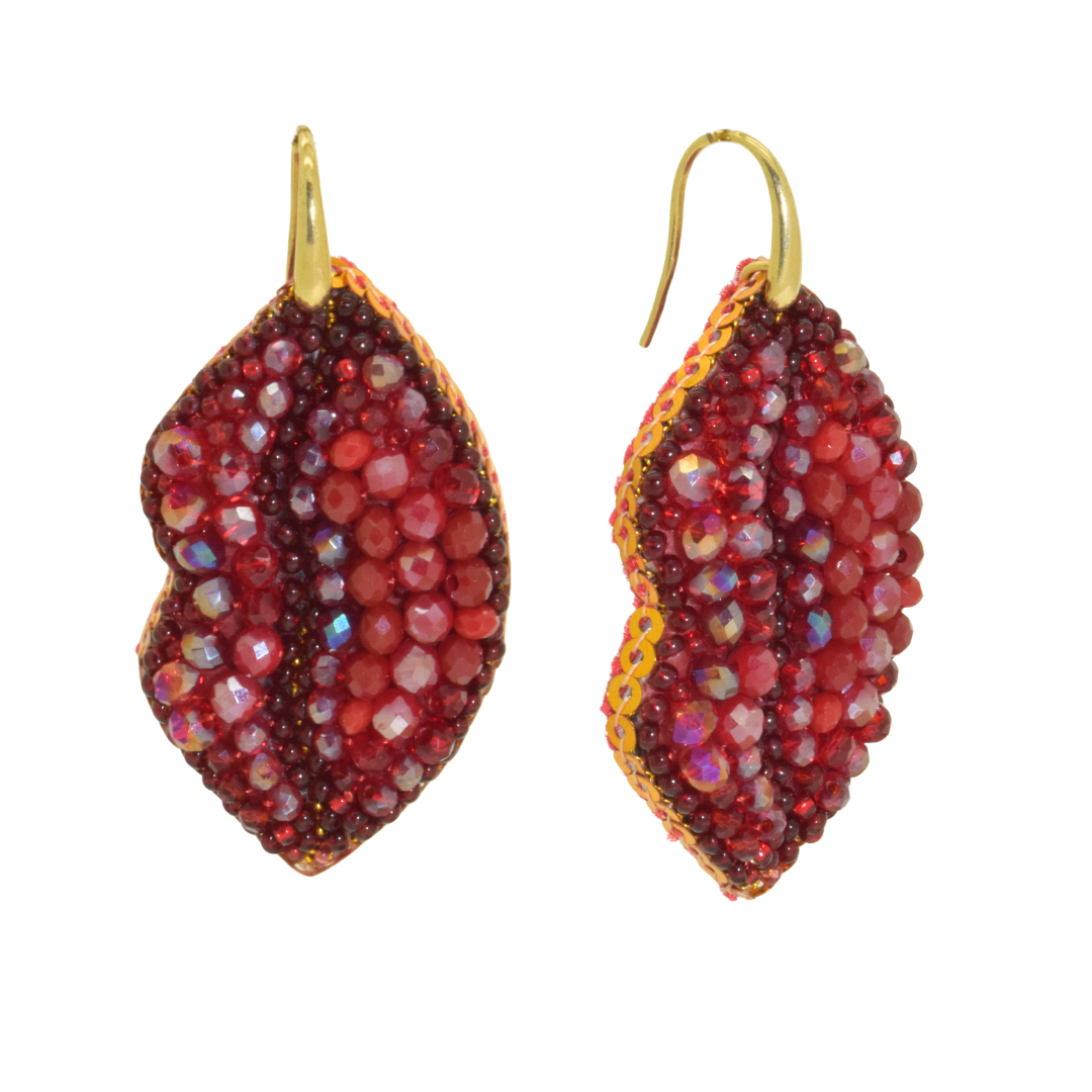 Hand-embroidered with countless faceted beads in deep red and burgundy tones, they catch the light with every movement. The organic shape feels almost like a natural object – soft, layered, and full of character.