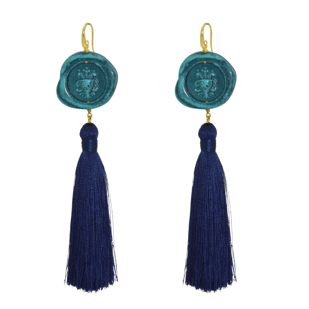 Diese erstaunlichen „Letter to The King“-Ohrringe bestehen aus wunderschönen blauen Buchstabenstempeln mit einer mittelalterlichen Gravur und einer blaugrünen Quaste. Diese Ohrringe sind schicke und lustige Hingucker.